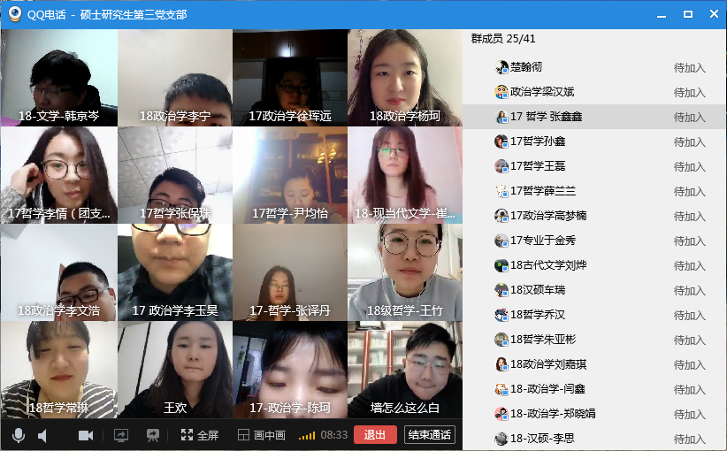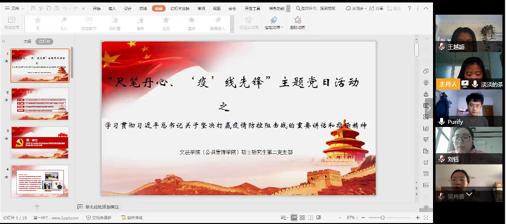硕士研究生第一党支部多名党员主动担任抗“疫”志愿者,亲身参与疫情防控工作,他们通过微信视频会议平台,讲述抗疫故事、分享心得感悟,给支部全体党员带来了一堂既感动又暖心的沉浸式党课。