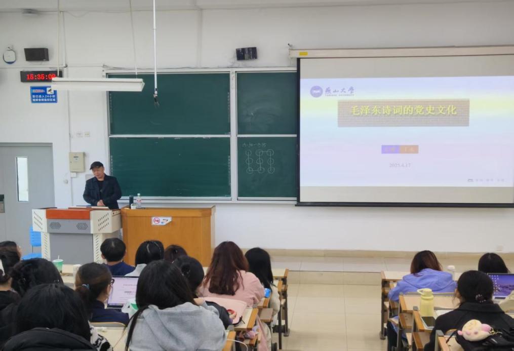 王永在课堂中精选了多篇毛泽东诗词的书法手稿,为大家详细解读每篇诗词背后的党史故事,带领大家理解和把握毛泽东诗词的文化内涵与时代价值,共同感受中国共产党的艰辛奋斗历史。课上,王永鼓励学员进一步把握毛泽东诗词中所承载的革命先烈为民族独立、人民解放英勇奋斗的革命历程,感悟他们在革命实践中形成的革命乐观主义精神与革命奋斗精神,结合文科专业特长将中国共产党人精神发扬传承下去。