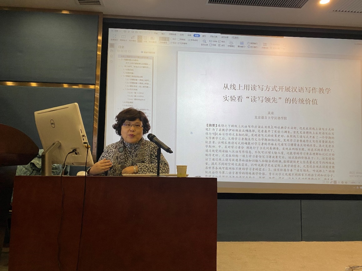 疫情防控背景下线上汉语写作的教学方法是一个值得探讨的话题。吴双老师通过实验给出这个问题的答案。她认为,就目前形势而言,外国职工的汉语写作教学可以采用线上听说,或线上读写的方式,重点是要考虑哪种方式更利于教学。根据实验与调查数据,吴双老师认为,线上读写式的教学方法对学习者的书面表达读写习惯带来良好的改变,相关教学方法的探讨,对于汉语国际教学具有多方面的意义,如传统汉语作为第二语言教学的特殊教学价值探索、学习者习得汉语书面表达的范式选择、学习者的汉语书面表达能力的提高,以及传统的“读写领先,听说跟上”的教学原理等等。吴双老师强调,汉语教师应该根据实际情况进行教学方法的选择,无论是“听说领先”,还是“读写领先”,应该实事求是,根据员工学习汉语的实际能力和水平进行选择。