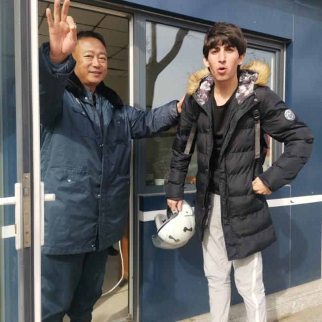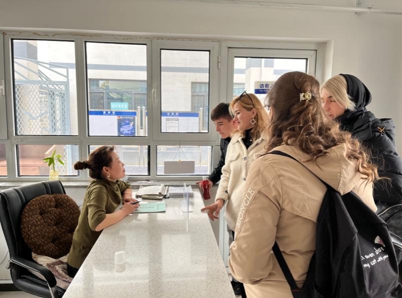 (齐铭、谷贺、阿丽雅、韩立沐和宿舍管理员交流)