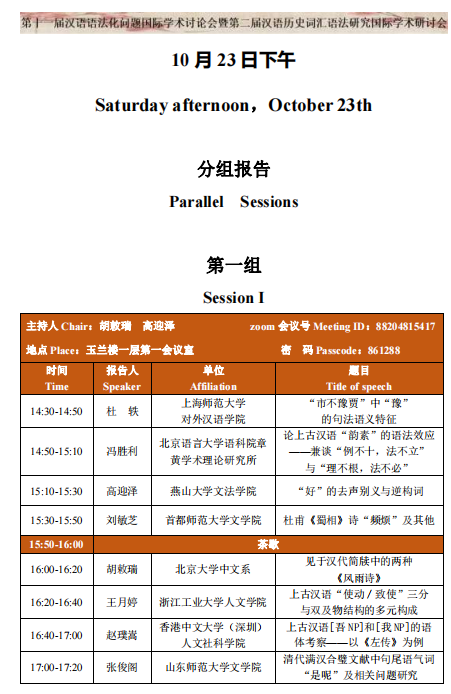 本次会议共有大会报告8场和小组报告10场,100多位学者通过线上或线下的方式进行了报告和讨论。高迎泽老师与北京大学胡敕瑞教授共同主持了10月23日下午第一小组的小组报告和讨论。高迎泽老师做了题为《“好”的去声别义与逆构词》的小组报告。该报告考察了上古汉语中“好”字的去声别义现象,并从逆构词的角度进行了全新的诠释。该报告引起了与会学者较大兴趣,大家围绕上古汉语的去声别义及相关问题进行了热烈的讨论。