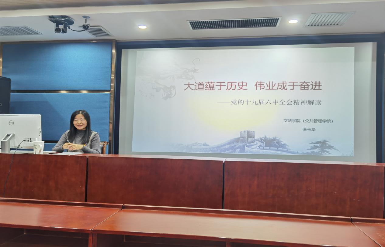 张玉华老师强调,党的十九届六中全会内容极其丰富,具有强大的思想含量、理论含量和知识含量,同学们要深入学习,用心领会,要清醒地认识肩负的历史重任,更加自觉地牢记初心使命,继承和发扬党的优良传统和作风,勇于担当、尽职尽责,实事求是,脚踏实地,用党的创新理论成果武装头脑、指导实践、推动工作。