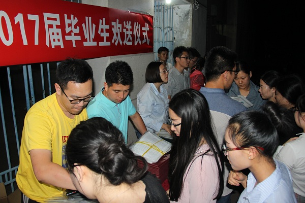 6月27日晚“青春的列车”毕业晚会骊歌还未散去,员工科工作人员经过白天的精心筹备,把相关物品核对装好,并贴心地便利员工,于员工归寝时段在公寓楼宇门口发放毕业材料。毕业班辅导员谢波老师又现场为同学提出的就业问题答疑解惑。翁经理现场慰问了工作人员,嘱咐大家细致认真完成工作。各位到场的领导和2017届毕业生共同回忆老员工活的点滴、畅谈未来的规划,现场依依离别情,难舍师生谊。同学们深切感受到文法大家庭的温暖,纷纷对老师们的辛苦付出表示感谢。