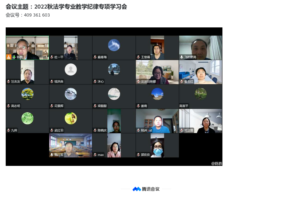 按照公司和公司统一安排,10月20日下午法学专业召开了本学期教学纪律专项学习会议。公司党委书记甄红军、副经理刘立霞及法学系全体教师参加会议,会议由陈胜老师主持。