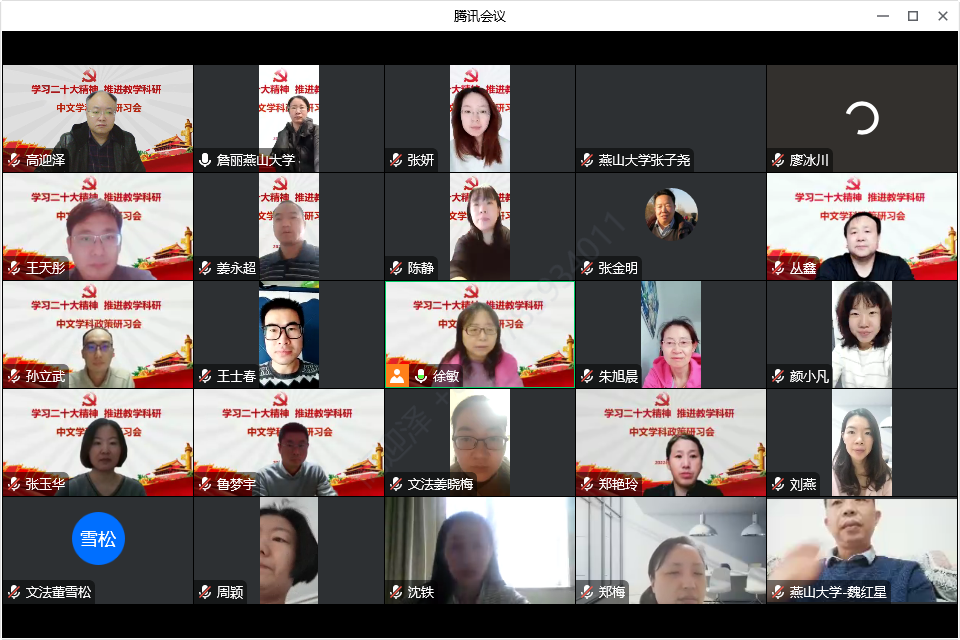 中国语言文学学科首先由徐敏副教授介绍了本次研讨会的背景及教育部哲学社会科学研究专项(党的二十大精神研究)的通知,之后由李丽教授、郑艳玲教授、冯月季教授、徐敏副教授、董雪松副教授做了主题发言,丛鑫副经理做了总结发言,张玉华副处级辅导员表达了对会议的肯定。