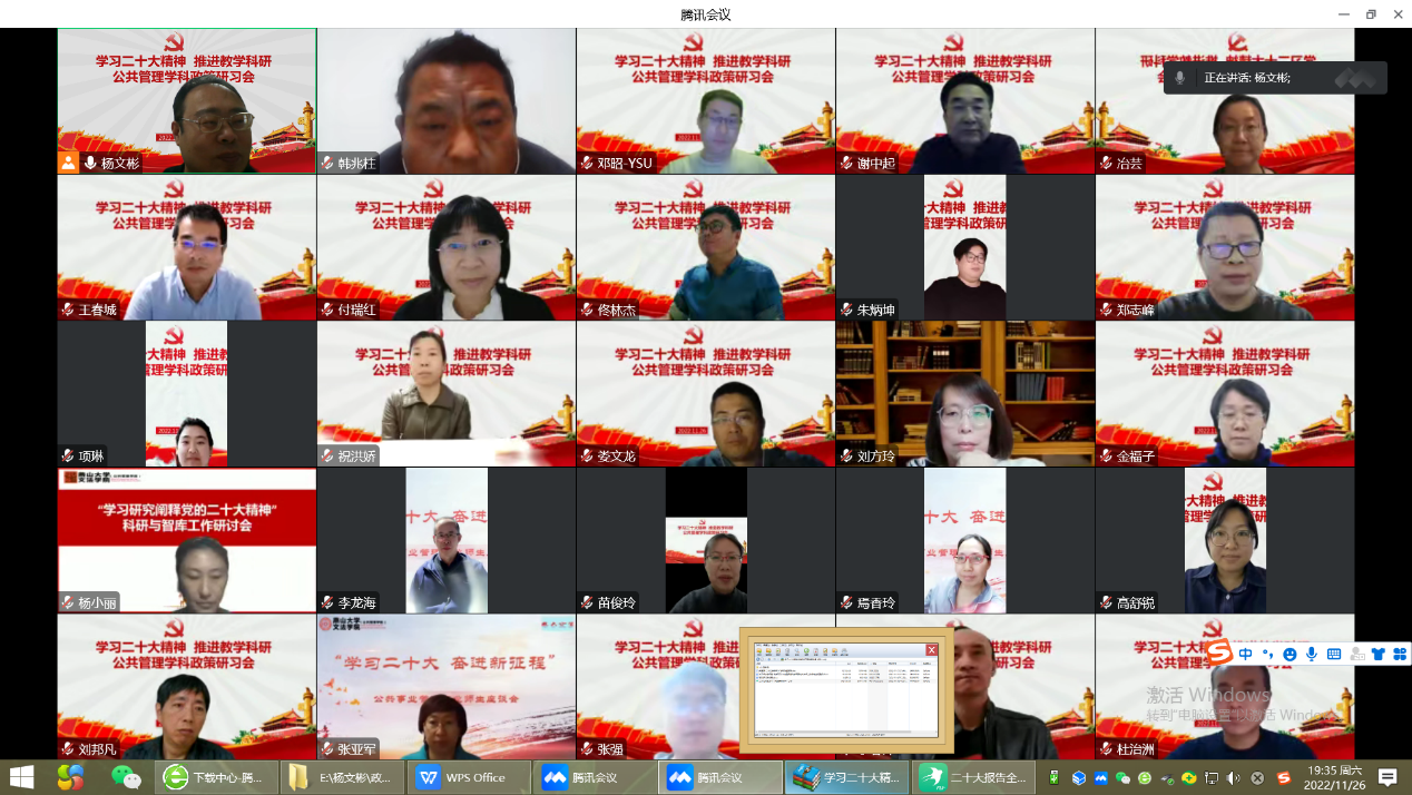 在主题发言环节,刘邦凡教授结合党的二十大报告中有关人才建设的论述,阐释了优化团队队伍和提高员工培养质量的重要性及其途径。王春城教授系统梳理了党的二十大报告中有关乡村振兴的论述,提出公共管理学科要抓住机遇,从制度、体制、机制和政策等方面研究乡村振兴,为乡村振兴这一伟大事业贡献本学科的力量。于春洋教授结合党的二十大报告中有关社会主义现代化强国建设的论述,概括了建设社会主义现代化强国的目标、任务和环节,并阐述了社会主义现代化强国建设给民族政策研究提出的新要求、新课题。在随后的讨论环节中,老师们围绕团队队伍建设、学科方向、学科特色、教学与科研团队建设等主题进行了热烈讨论。最后,郑志峰副经理做了总结发言,指出公共管理学科的发展,离不开对党和国家重大战略政策文件的研读与阐释,党的二十大的召开,为公共管理学科的发展指明了新的方向;专业教师要认真学习党的二十大报告,紧跟中国式现代化建设中的重点课题,结合自身的科研基础,积极申报科研项目,产出高水平成果,并努力回应社会经济发展的需求,做好社会服务工作。