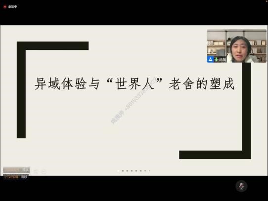 凤媛老师做了题为《异域体验和“世界人”老舍的塑成》的讲座。讲座从提出“老舍作为一个地方色彩很强的作家,是如何看待“世界”的”这一问题出发逐步展开。首先,凤媛老师对“世界人”和世界主义思想作了梳理,包括从梁启超的“世界人”到鲁迅对“世界人”的反思,再到周作人的“世界民”。其次,凤媛老师在上述话语体系下,详细解读了老舍世界主义思想形成的几个阶段。透过作品来看,老舍英伦时期的世界主义思想以《二马》为代表,而南洋时期受到康拉德的影响则以《小坡的生日》为代表,都反映出了老舍在不同语境下的世界主义的表现。此外,凤媛老师还特别讲到了老舍的旅美经历与超越冷战思维,分析了老舍在《四世同堂》中作为一个反省者对东方人的思考。最后,凤媛老师点明从“世界人”和世界主义思想角度来重新认识老舍,会进一步发现其重要性以及老舍本身在东西方文化中的交合性。