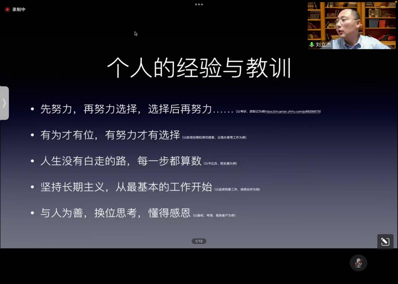 从考研与获取留校资格担任辅导员的选择,再到辞职做刑事律师的选择,从内勤到书记员、助理审判员、审判员再到借调最高人民法院的一步步努力;如何选择以及做出选择后如何努力——贯穿刘立杰律师的人生经历,也将影响着与会同学们的一生。通过刘立杰律师的分享,能够感受到个人从没选择、被选择到自己范围内可以有所选择的努力。