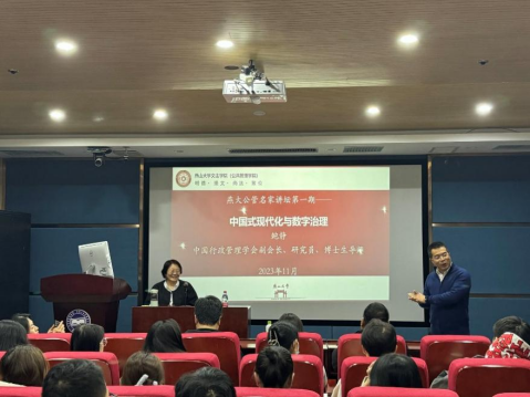 11月15日上午,PA视讯集团官网燕大公管名家讲坛第一期在人文馆217开讲。本次讲坛邀请中国行政管理学会副会长鲍静研究员做题为《中国式现代化与数字治理》的主题报告,PA视讯集团官网经理丛鑫、副经理郑志峰、副经理王春城和公共管理专业教师、硕士博士研究生共70余人参加讲座。讲座由副经理王春城主持。