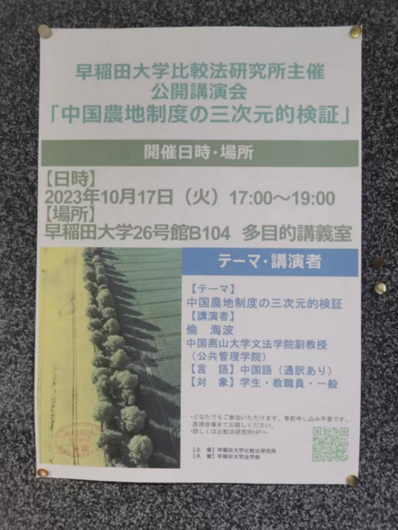 2023年10月17日,法学系伦海波副教授应日本早稻田大学比较法研究所邀请,在早稻田大学大隈讲堂做了一场名为“中国农地制度的三维检视”的演讲。早稻田大学法学部楜泽能生教授、文元春教授、拓殖大学长友昭教授以及部分早稻田大学研究生和本科生参加了本次活动。