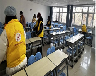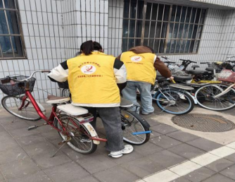 志愿者清理桌洞 志愿者摆放车辆