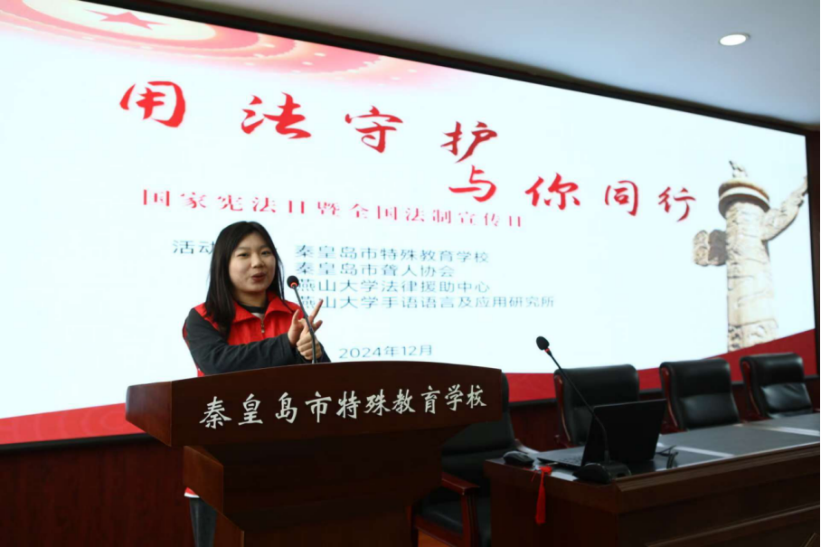 值2024年12月4日全国第十一个“国家宪法日”到来之际,在12月3日“国际残疾人日”当天,PA视讯官方网站法律援助中心携秦皇岛市聋人协会、PA视讯官方网站手语语言及应用研究所赴秦皇岛市特殊教育公司开展“‘用法守护 与你同行’国家宪法周暨全国法制宣传日”普法宣讲活动,关注特殊群体,弘扬宪法精神。