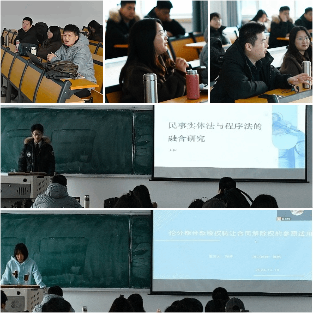 论坛伊始,获奖同学宣讲环节有序展开。王林同学汇报了论文《民事实体法与程序法的融合研究》、张欣冉同学汇报了论文《论阅核制背景下院庭长的监督权及其责任》、张妍同学汇报了论文《论分期付款股权转让合同解除权的参照适用》。汇报论文研究涵盖了法学多个重要领域,从不同视角展现了扎实的学术功底与创新思维。