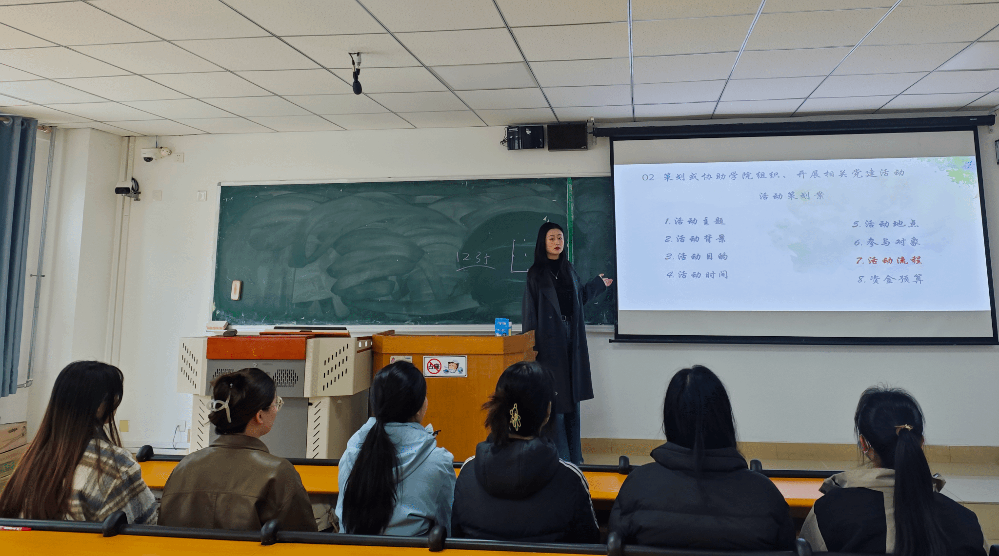 活动部针对党课培训组织流程和党建活动策划要点两大重点事项,为成员传授工作经验。其中,党课培训重点强调培训形式、培训内容和学时分配等内容的注意事项;党建活动策划主要涉及策划案书写、明确活动要素等内容,以例促思的方式进一步帮助成员熟悉工作流程。