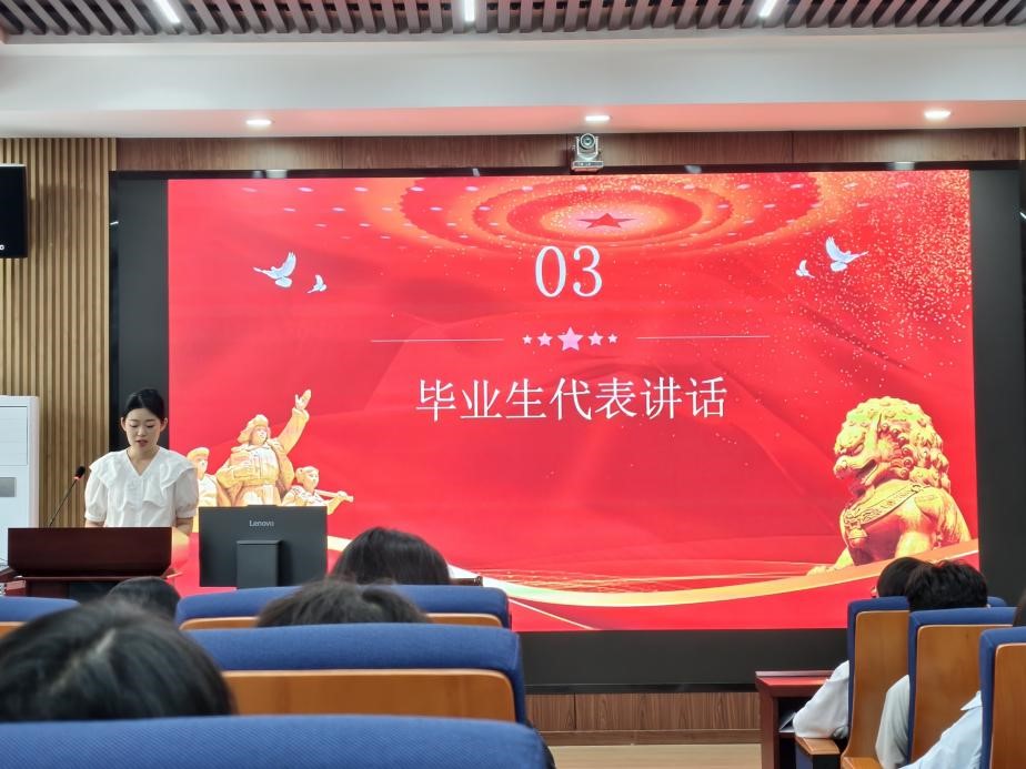 姜明玉作为毕业生党员代表上台讲话,她表示,在党组织的培养和教育下,自己从一名懵懂的员工逐渐成长为有理想、有担当的共产党员。姜明玉鼓励全体毕业生党员,将个人理想融入党和国家的事业发展中,在新的岗位上继续发挥党员的先锋模范作用,以实际行动践行入党誓言。