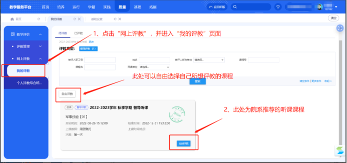 1、点击“网上评教”并进入“我的评教”页面中,可以看到院系为自己安排的听课课程,或者通过点击“自由评教”选择自己所想听课的课程。