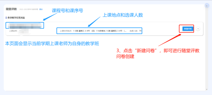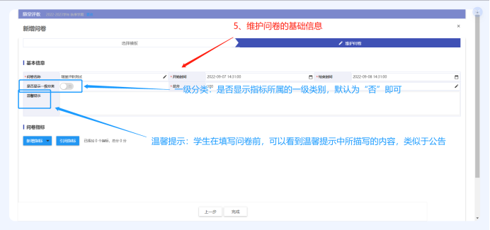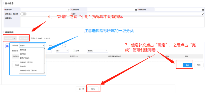 注意事项:1、“基础设置”菜单为“指标库”,可以查看和新增指标,新增的指标可以用在创建“随堂评教”问卷中(或直接创建“随堂评教”问卷,在问卷中直接新增指标也可)