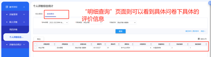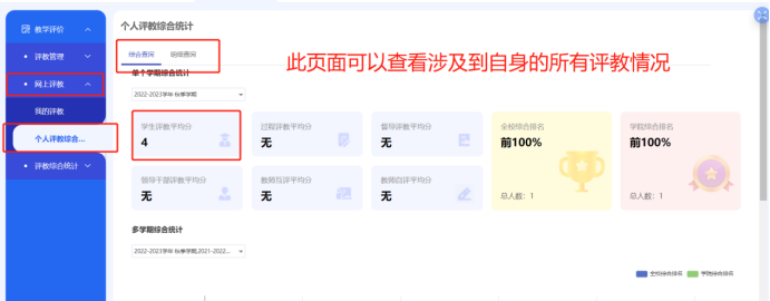1.教师可以在此页面查看涉及到自身的所有评教信息。例如自己所授课程员工评教情况、随堂评教情况等。