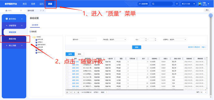 (2)登录成功之后,鼠标移至上方“质量”菜单,点击“随堂评教”即可进入“随堂评教”页面。