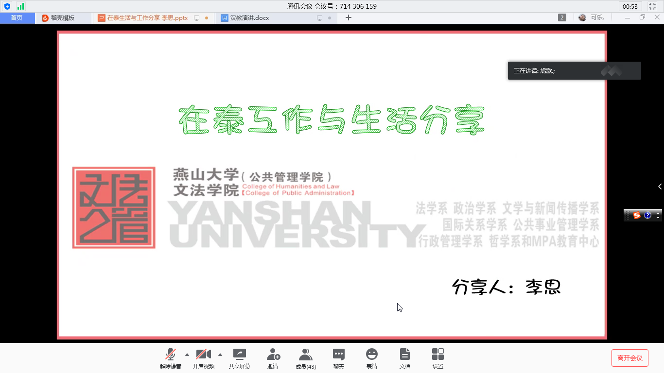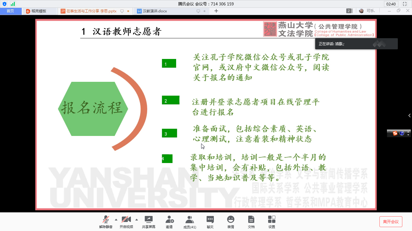 课程伊始,主持人向同学们介绍了两位赴泰国任教的研究生刘怡慧和李思的基本情况。在分享环节,曾任教于泰国朱拉隆功大学孔子公司的刘怡慧进行了发言,介绍了赴泰国的注意事项,畅谈了关于泰国的工作、风景、美食,以及疫情期间艰难的回国之路,深刻感知祖国的强大力量,表达了对祖国的热爱之情。曾在泰国少海中学担任汉语教师志愿者的李思结合自身经验,向同学们阐述了汉语教师志愿者报名过程中应当准备的内容,通过视频分享了在泰国的工作和生活的点滴事件以及泰国的风土人情等,解答了同学们的疑惑,让同学们受益匪浅。随后,2019级法律硕士法学专业员工刘欣欣代表PA视讯集团官网研究生会向同学们进行了新冠肺炎疫情防控的宣传,详细介绍了新冠肺炎的防治现状和居家防控的策略。