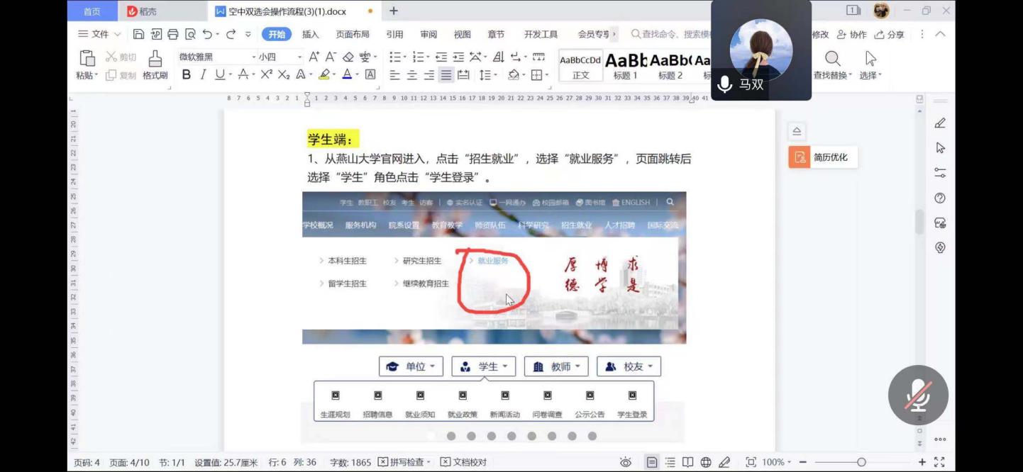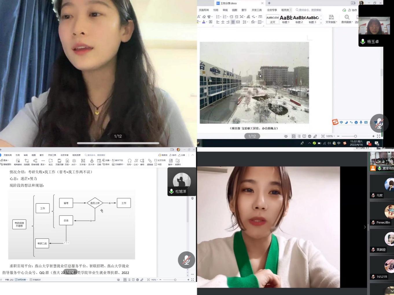 会上,马双老师为毕业生介绍了线上参加就业洽谈会的流程及注意事项,姜一凡老师讲解了线上签约系统的操作步骤等就业服务系统的使用知识。王奕骅老师介绍了公司最新的就业帮扶举措:组建针对性较强的就业信息交流群;新媒体平台开设“青云‘职’上”栏目,每周推荐优质的招聘信息;开展一系列求职技能讲座和考试经验分享,包括公考、选调交流、事业单位上岸经验介绍等。王老师也提醒毕业生,在遇到困难时要积极主动向公司、公司有关部门及老师寻求帮助和指导,要树立信心、找准定位、抓住机会、果断行动、笃行不怠、久久为功。